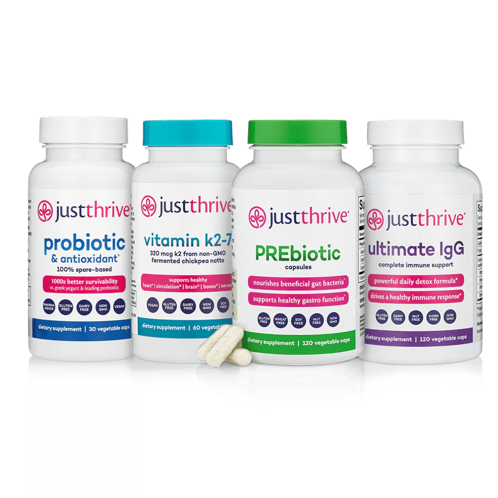 This bundle includes: Just Thrive Probiotic + PREbiotic + Ultimate IgG + Vitamin K2-7