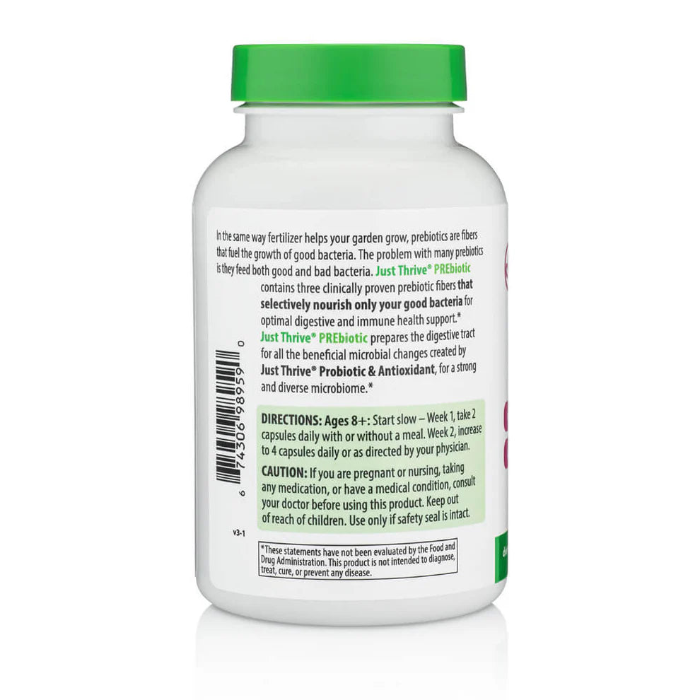 PREbiotic: In the same way fertilizer helps your garden grow, prebiotics are fibers that fuel the growth of gut bacteria. The problem with most prebiotic products is that they feed both good and bad bacteria. PREbiotic contains three "smart" fibers clinically proven to ONLY feed your good gut bacteria. When combined with Just Thrive Probiotic, studies show it can more than DOUBLE your population of good bacteria.