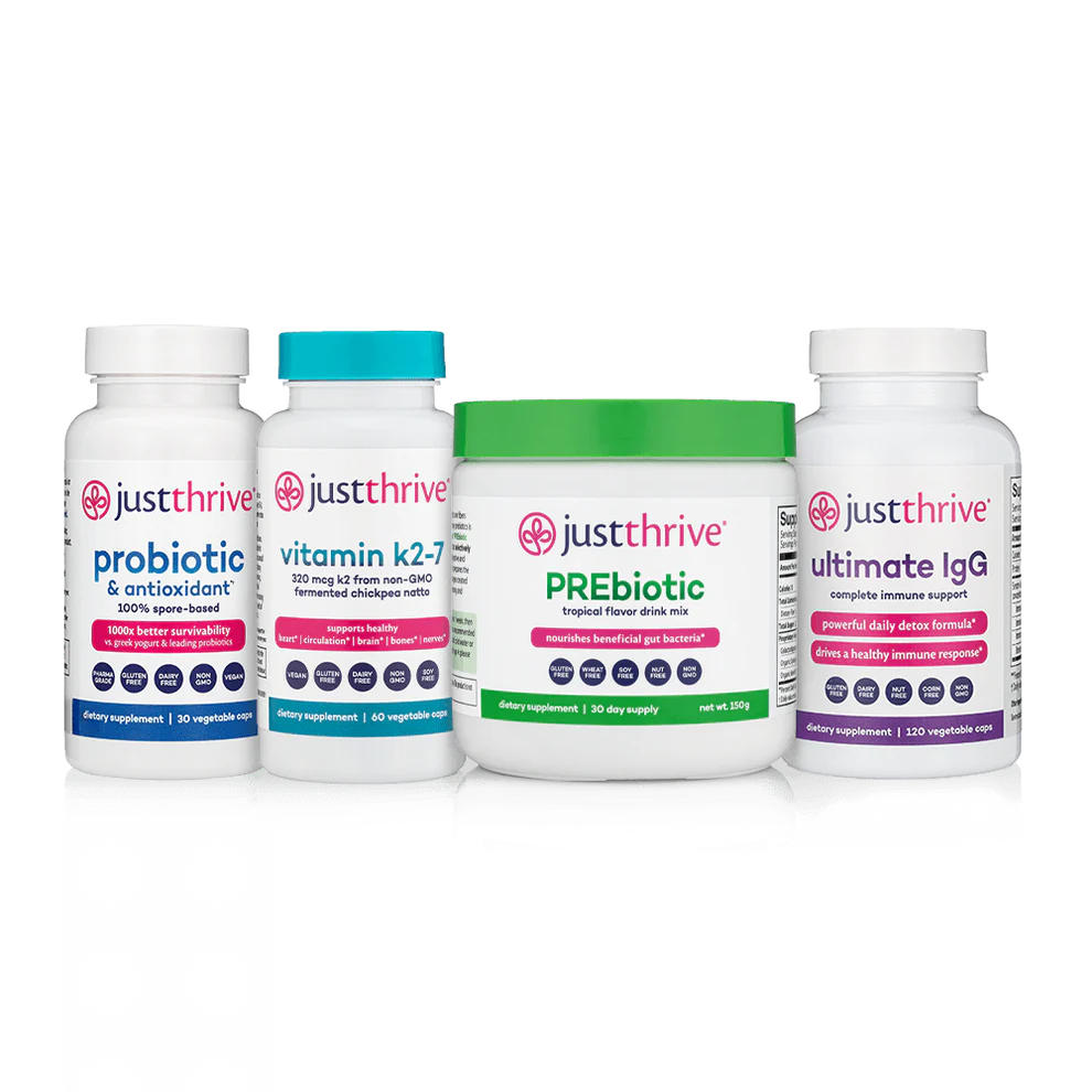 This bundle includes: Just Thrive Probiotic + PREbiotic + Ultimate IgG + Vitamin K2-7