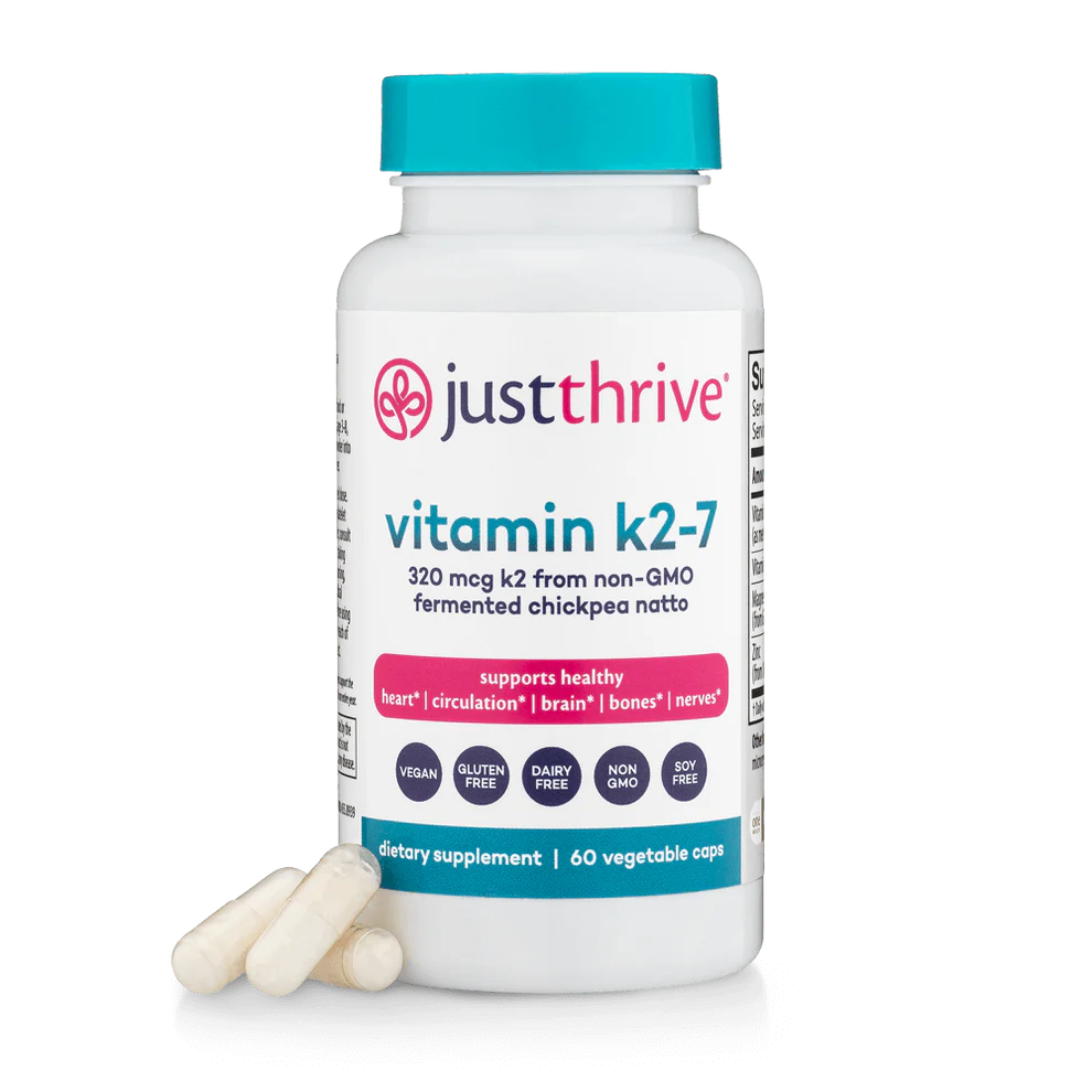 Vitamin K2-7: Even though experts advise you need just 320 mcg of vitamin K2 a day for total body health, 97% of people in the western world are K2-deficient! That’s because it’s near impossible to get through diet alone (unless you eat lots of organ meat or multiple bowls of the pungent Japanese dish natto.) That’s why we created Just Thrive Vitamin K2-7 – the only retail K2 on the market with: