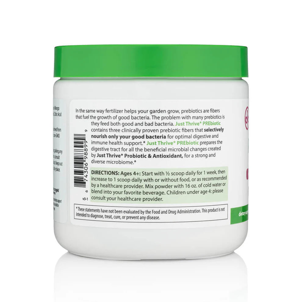 PREbiotic: In the same way fertilizer helps your garden grow, prebiotics are fibers that fuel the growth of gut bacteria. The problem with most prebiotic products is that they feed both good and bad bacteria. PREbiotic contains three "smart" fibers clinically proven to ONLY feed your good gut bacteria. When combined with Just Thrive Probiotic, studies show it can more than DOUBLE your population of good bacteria.
