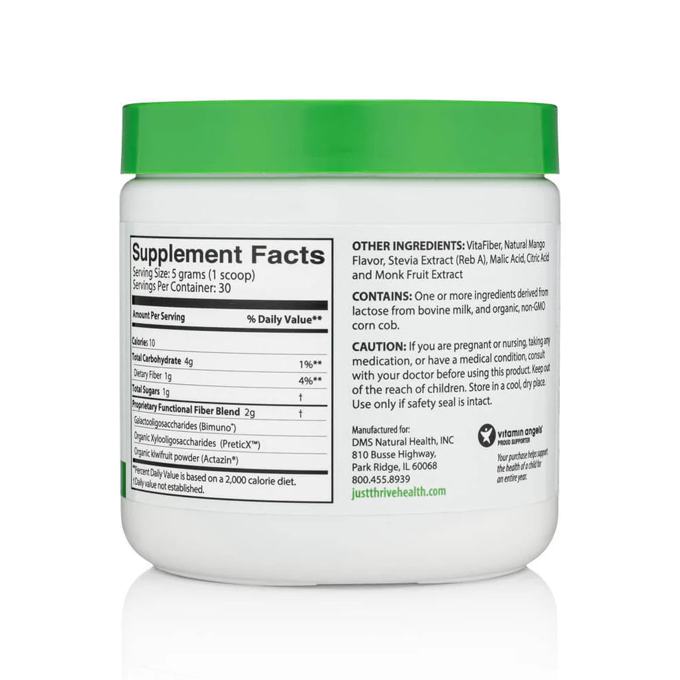 Supplement Facts: Serving size is 5 grams (1 scoop) with 30 servings per container. Each serving provides 10 calories, 4 grams of total carbohydrates (1 gram dietary fiber and 1 gram sugar), and a 2 gram proprietary functional fiber blend consisting of galactooligosaccharides (Bimuno®), organic xylooligosaccharides (PreticX™), and organic kiwifruit powder (Actazin®). Other ingredients include VitaFiber, natural mango flavor, stevia extract (Reb A), malic acid, citric acid, and monk fruit extract. This product contains one or more ingredients derived from lactose from bovine milk and organic, non-GMO corn cob.
