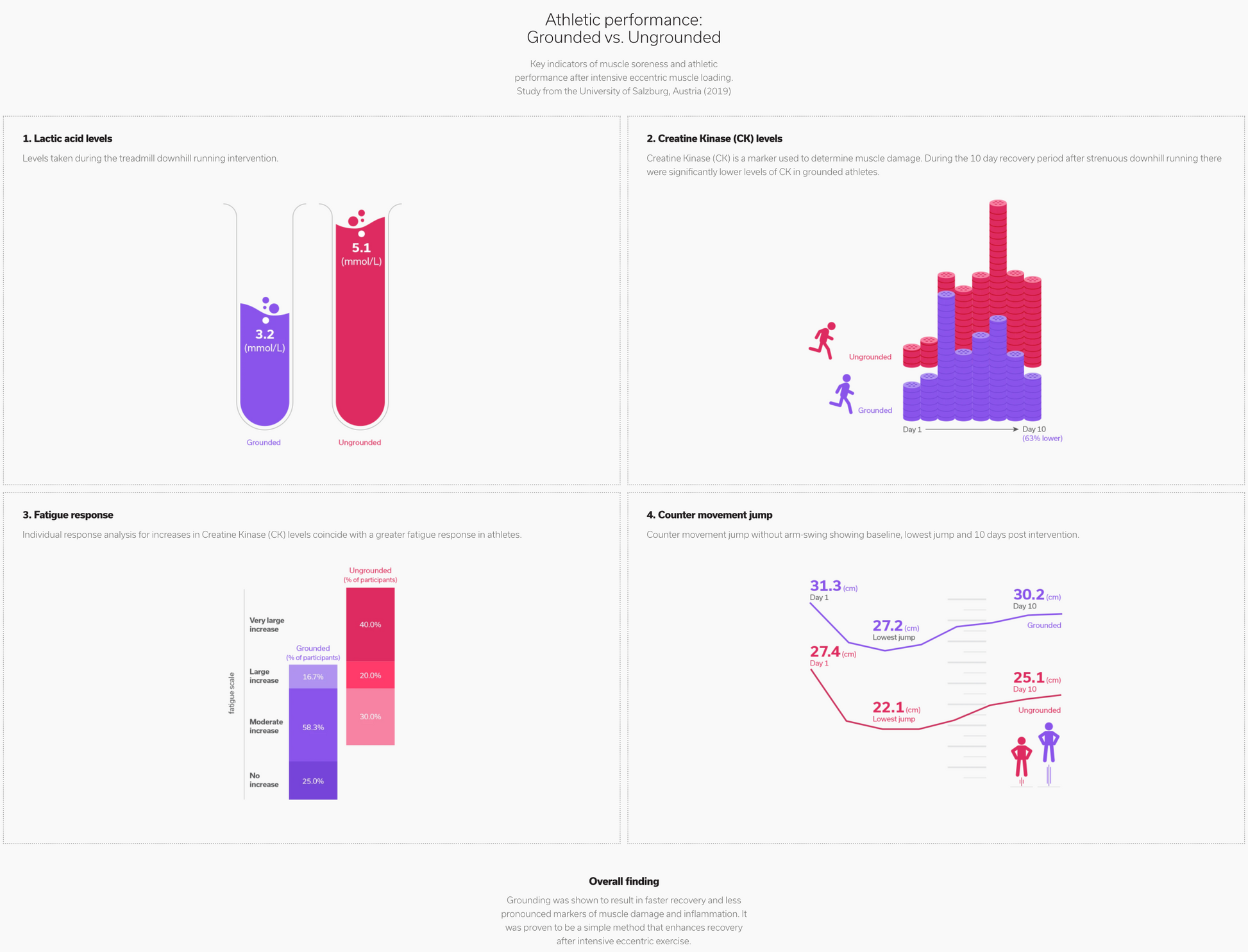 2019 study in Salzberg, Austria concluded that grounding was shown to result in faster recovery and/or less pronounced markers of muscle damage and inflammation.* It was proven to be a simple method that enhances recovery after intensive eccentric exercise.